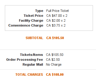 Just bought some tickets on Ticketmaster and couldn't believe all the little fees that they add on. Why can't they just bundle these charges in to the ticket price? The "order processing fee", although it is added on to the "order" not the ticket, could also be bundled in to their overall costs. Make it a fixed cost per ticket rather than a cost per order. The "order processing fee" was especially annoying because when I was asked to select how I wanted my tickets (standard mail, express mail, pick-up, etc...) I chose standard mail because it said "Free." What is the "convenience charge" anyways? Just put everything together in to one fee and tell what it is up front. Break-it down later if you want.